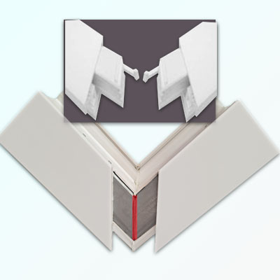 Az AMG műanyag bejárati ajtók gyári, hegeszthető sarokmerevítő idommal készülnek, melyek csökkentik a vetemedést és növelik a szerkezet stabilitását.
